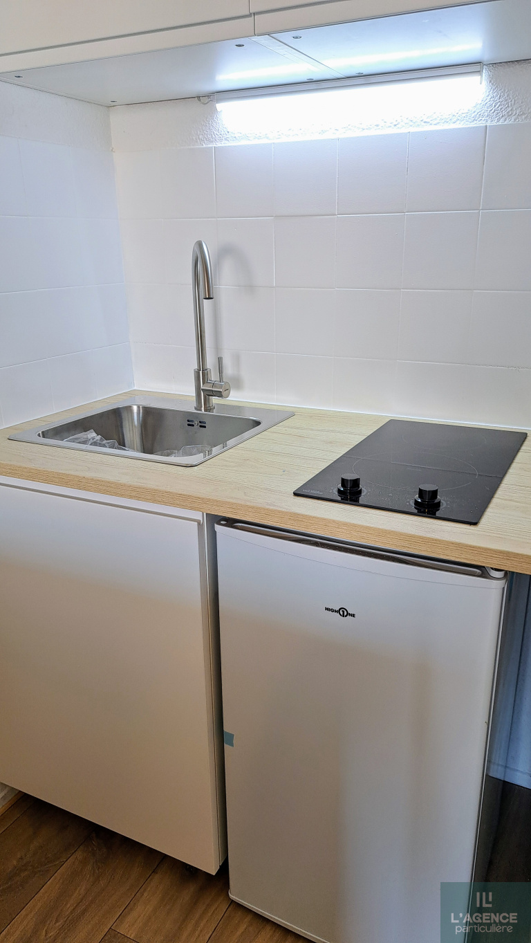 - Un espace cuisine (réfrigérateur, hotte aspirante, plaques de cuisson)