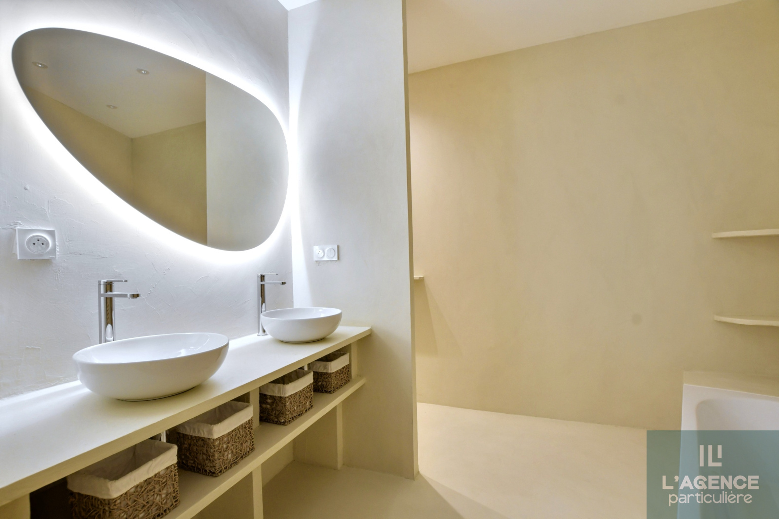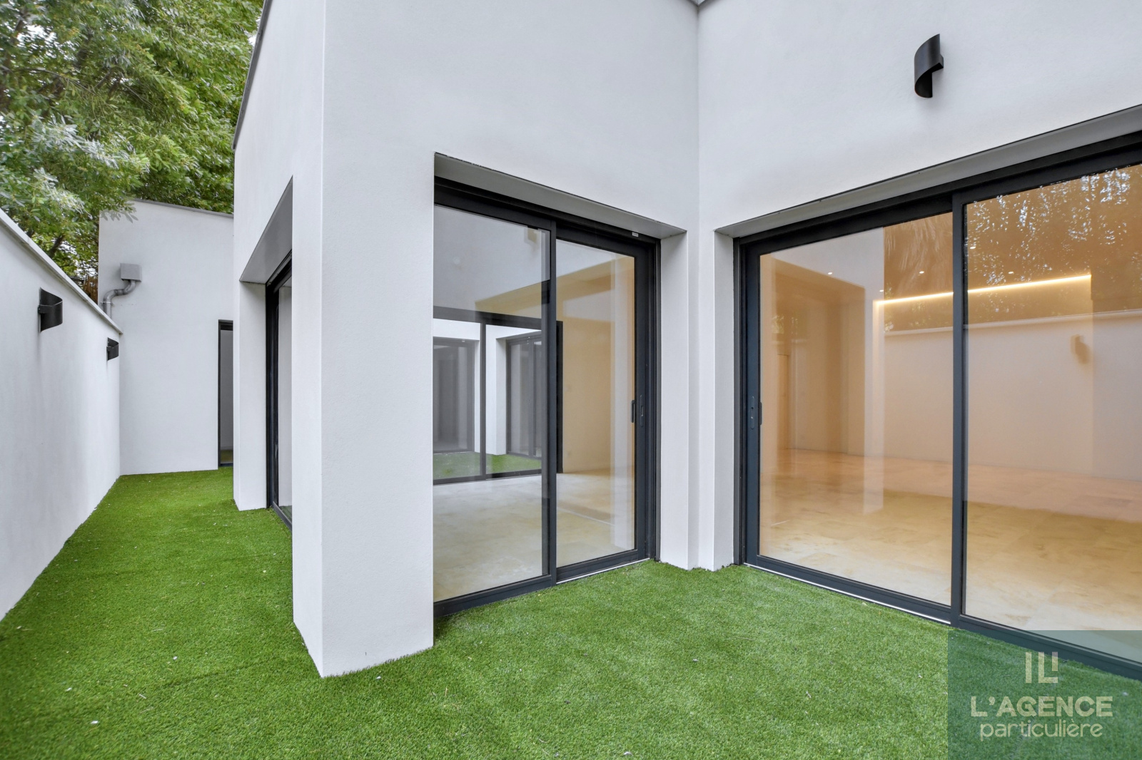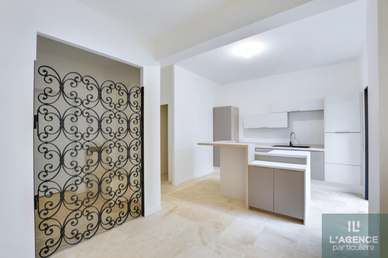 L'appartement se compose, d'une entrée avec dressing et wc, une porte élégante en fer forgé vous permettra d'accéder à une belle et lumineuse pièce à vivre de 65 m2 avec de grandes baies vitrées à galandages.Cet espace dispose d'une cuisine entièrement équipée avec buanderie ainsi qu'un accès indépendant au garage de 19m2. Vous trouverez également un coin bureau. Le tout donnant sur un extérieur intimiste à l'abri des regards.