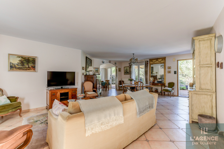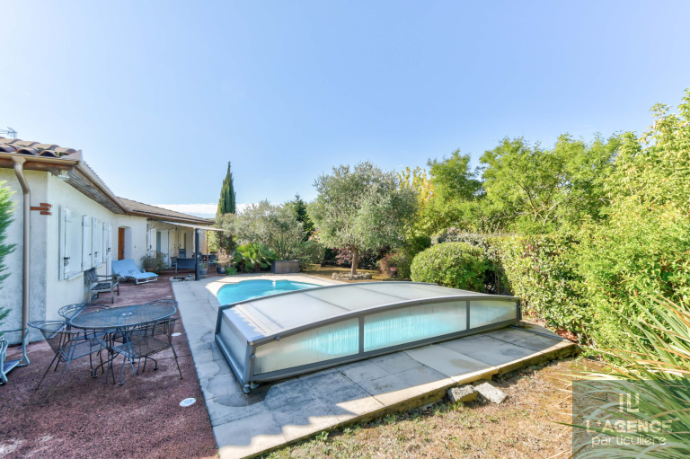 Le plus, un grand garage d'environ 30 m² avec porte électrique, une piscine 8X4 chauffée et couverte, un portail électrique, un puits, une climatisation réversible, le tout sur une parcelle arborée de 960m².