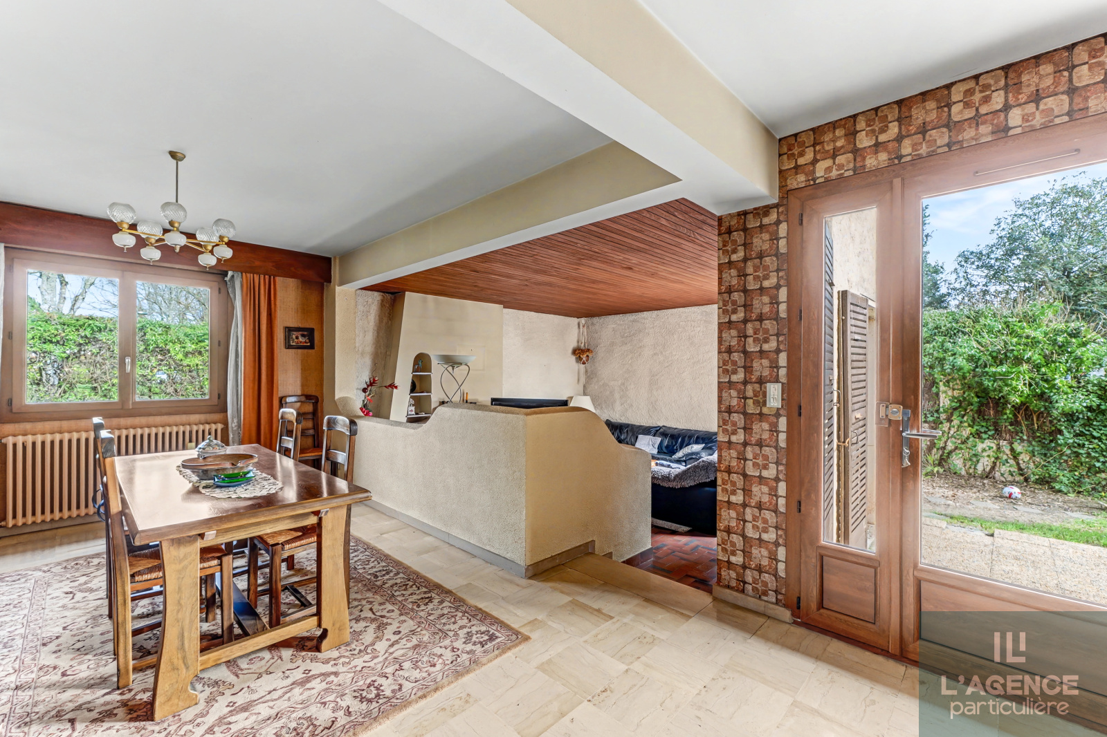 Elle se compose d'une vaste entrée avec placard, une cuisine séparée et équipée, la pièce de vie s'articule autour d'une cheminée comprenant une partie salle à manger et salon/séjour, ouvrant sur une belle terrasse.